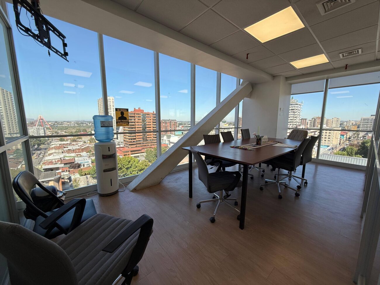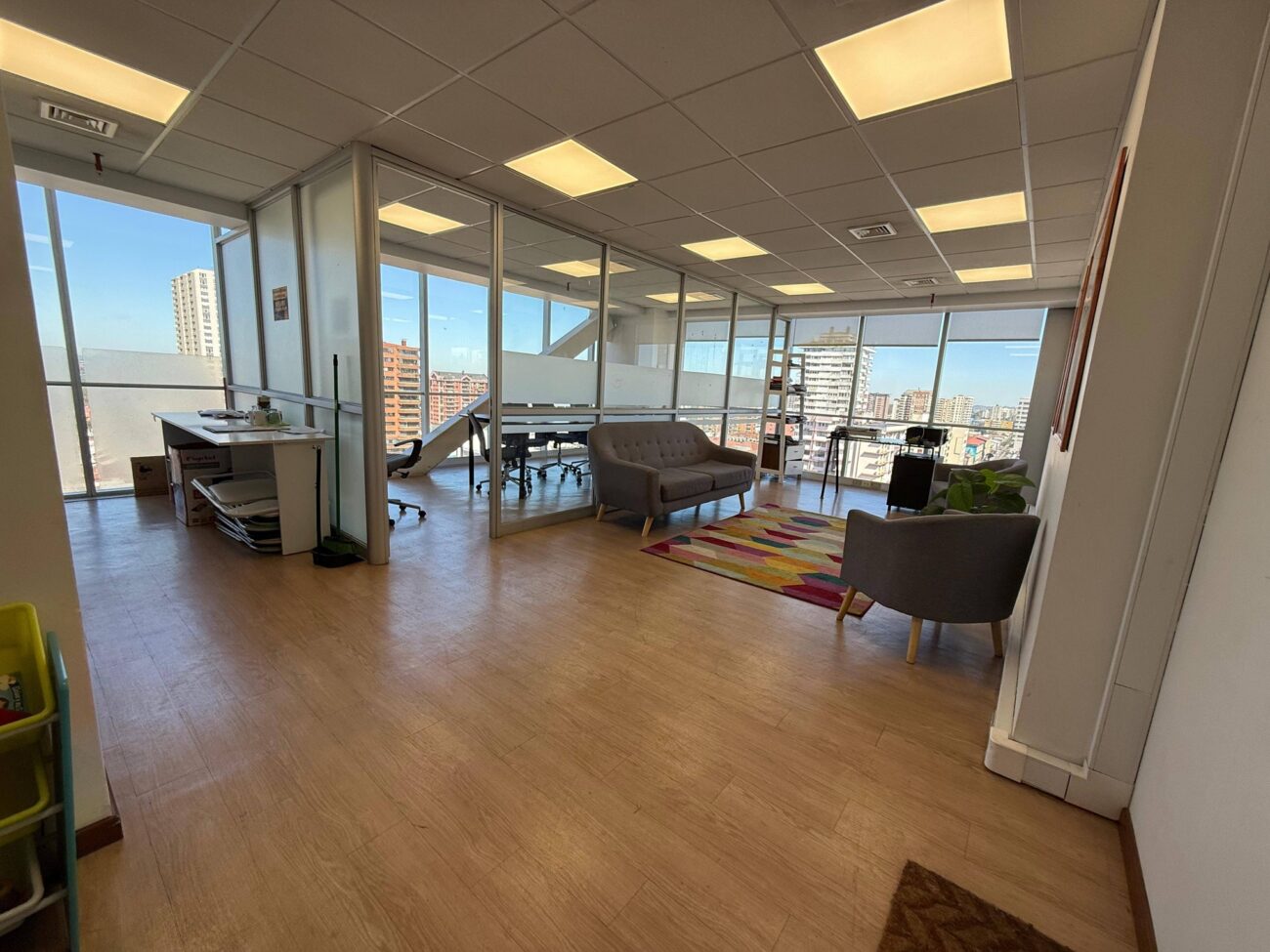 La oficina se encuentra en un piso alto con buena iluminación natural, ideal para profesionales, consultas o empresas que buscan un espacio de trabajo en un entorno formal y bien conectado.